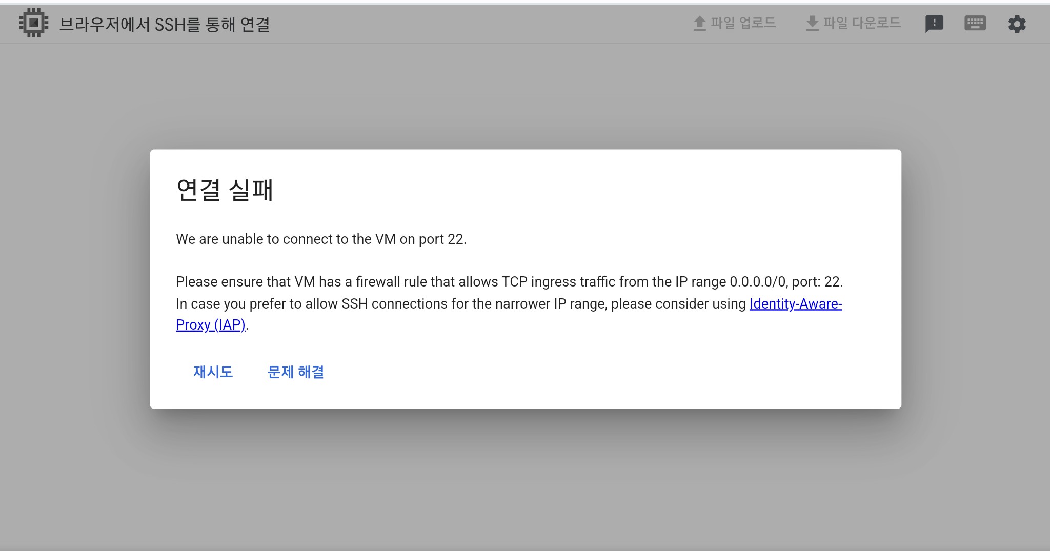 구글 클라우드 플랫폼으로 인스턴스 VM을 생성한 뒤 SSH 연결을 하는 과정에서 다음과 같은 오류가 발생하였고 아래와 같이 해결하였습니다.